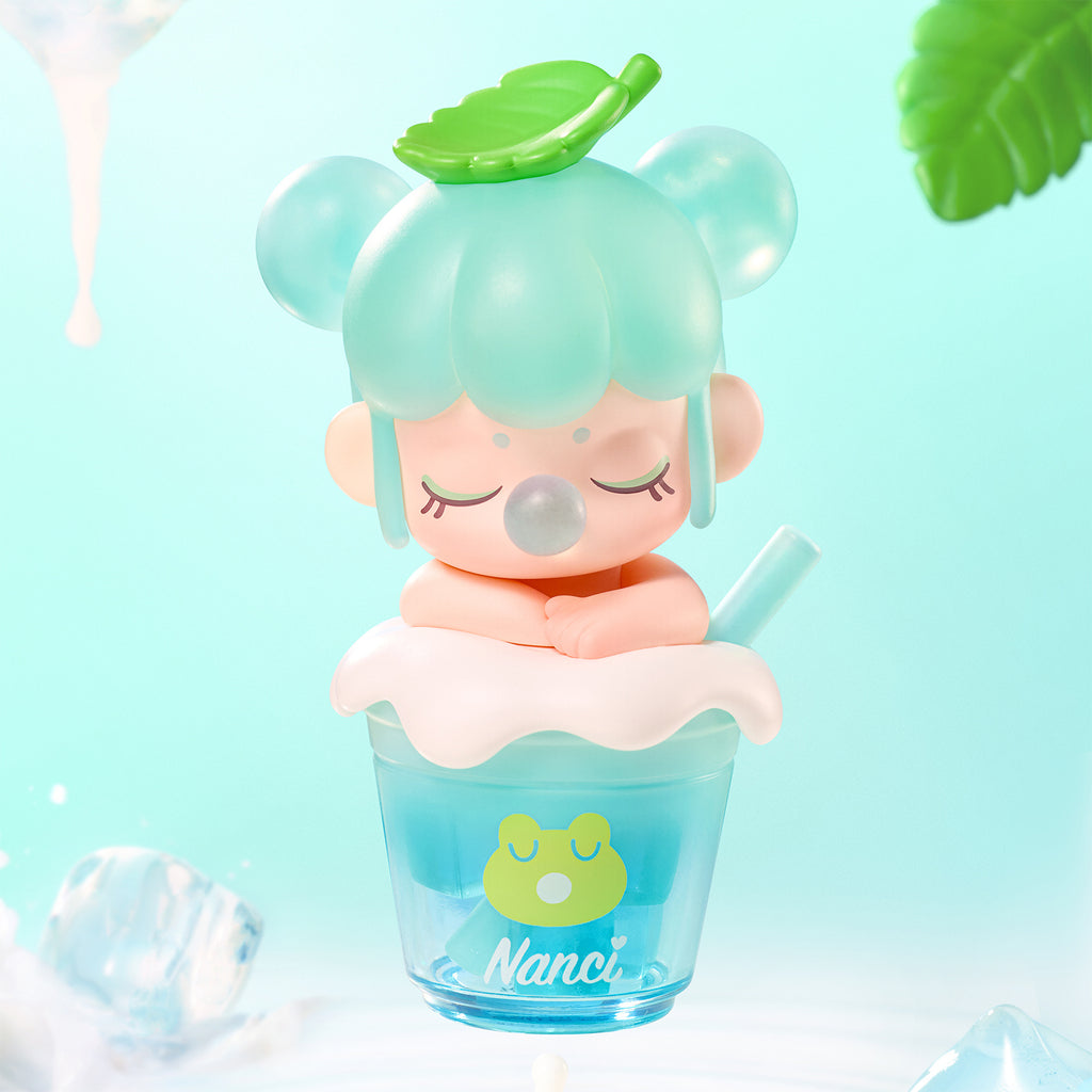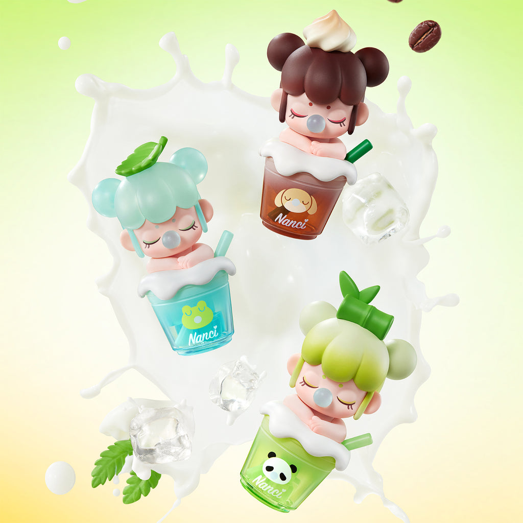 De Frost Milk Coffee Baby Nanci zit in een koffiebeker en heeft een romig toefje slagroom op haar hoofdje. Mint Green Tea Baby Nanci is fris en flitsend turquoise met een groen mintblaadje. Bamboo Oolong Tea staat in een groene beker met een pandabeer en een stukje bamboe op haar hoofd. Strawberry Milk Tea is zacht roze met … natuurlijk een aardbei bovenop! Cheese Milk Tea is opvallend kaasgeel en heerlijk eigenwijs. Blueberry Milk Tea heeft een blauwe bes op haar hoofd.