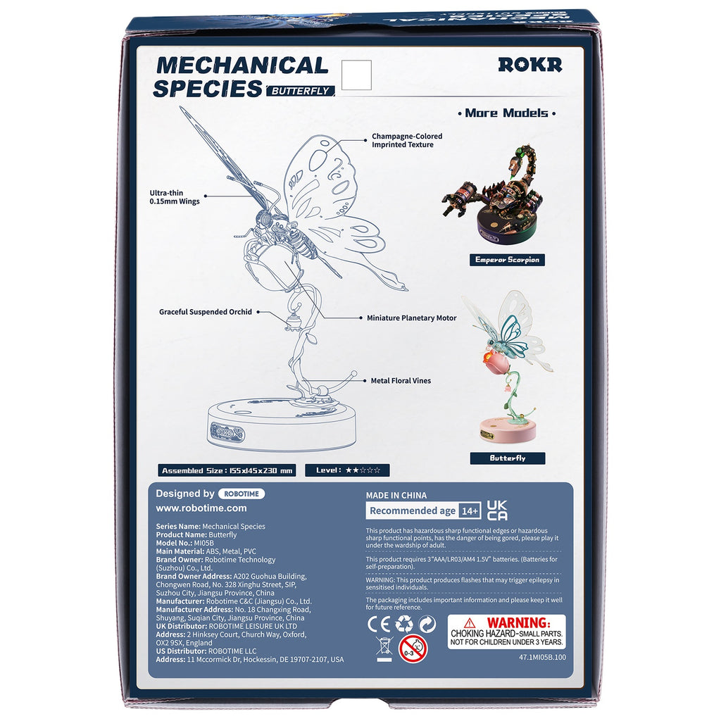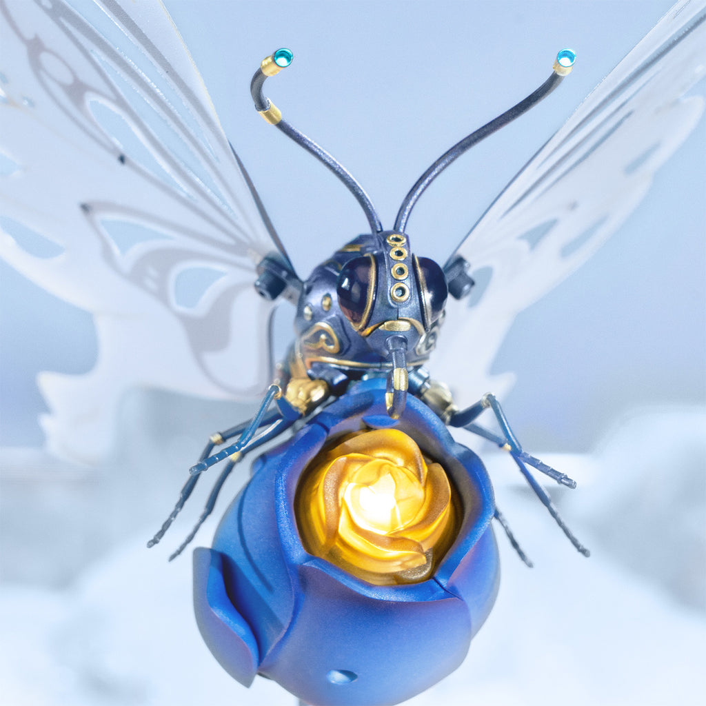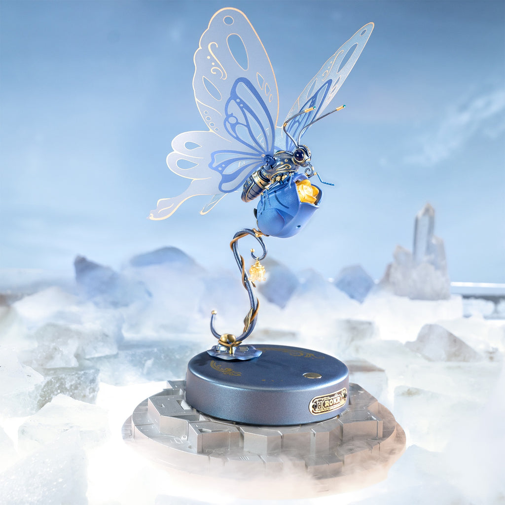 Maar dan mis je wel iets heel moois. ROKR heeft een mechanische bouwset van een supergave vlinder voor jou in petto. Op een ontluikende blauwe roos gaat een vlinder nectar drinken. Zijn opvallende, frêle vleugels zijn transparant en blauw met goudkleurige versieringen. Hij beweegt ze op en neer, precies zoals vlinders dat doen als ze op een bloem zitten. Zijn lijf is eveneens bijpassend blauw met goudkleurige lijnen en een blauwe “diamant” op zijn rug. Hij heeft donkerblauwe facetogen en zijn opgerolde tong en kop hebben ook weer mooie goudkleurige versieringen. Op de uiteindjes van zijn antennes zitten lampjes! Net als in het hart van de roos. Een lief hangbloemetje maakt het geheel af.