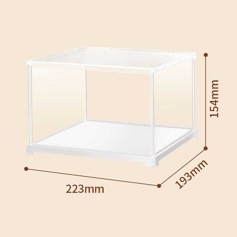Het fijne is dat je deze vitrine supersnel zelf in elkaar zet. Jij haalt het beschermfolie van de acrylglazen panelen en klikt de zes onderdelen eenvoudig in elkaar. Binnen vijf minuten staat alles stevig op zijn plek. De moeilijkheidsgraad is één ster, dus echt iedereen kan dit. Het heldere acrylglas zorgt voor optimaal zicht en de witte kunststof bodem laat jouw model mooi uitkomen. Met afmetingen van 223 bij 193 bij 154 centimeter past hij perfect op je plank of bureau. Dankzij het gaatje aan de onderkant kun je batterijdraden van verlichting netjes wegwerken.