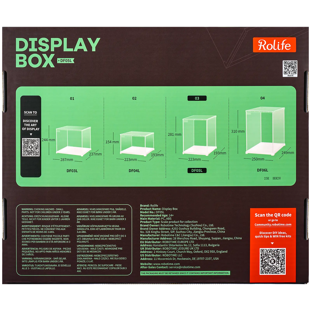 Met buitenafmetingen van 223 millimeter breed bij 193 millimeter diep en 281 millimeter hoog past hij vrijwel overal. De vitrine zet je binnen een paar minuten in elkaar. Jij haalt het beschermfolie van de acrylglazen panelen er zelf af en klikt de zes onderdelen vast in de gleuven. Moeilijkheidsgraad één ster, dus geen stress. Het transparante acrylglas zorgt voor helder zicht en superhandig, er zit een gaatje aan de onderkant! Dat is ideaal voor batterijdraden van verlichting of voor draden van functionerende modellen.