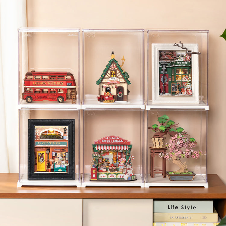 Die deur vinden wij een van de prettigste features van deze displaybox. Wil je je model verschikken dan hoef je niet de hele kap eraf te tillen. Stapel je meerdere vitrines, dan blijven ze stevig staan! Naast motivatie geeft de vitrine bescherming tegen stof en schade. Jouw model blijft langer mooi en netjes. Deze Rolife vitrines zijn compatibel met verschillende modellen, veel miniatuurhuisjes zoals de Muse Bookshop, maar ook bijvoorbeeld ook de Sakura Bonsai, een kleiner houten bouwpakket.