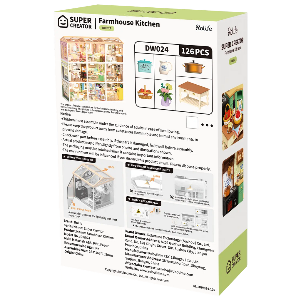 Wist je dat je op deze miniatuurkeuken bijvoorbeeld nog een slaapkamer kunt stapelen om zo een poppenhuis te creëren? We hebben van allerlei leuke scènes die hierbij passen en je kunt bijna onbeperkt stapelen. Wat dacht je van de Holiday Tea Time en Midsummer Dream Yard. Je kunt bij deze kunststof miniatuurhuisjes van de Super Creator serie ook transparante gevels en daken kopen. Onbeperkt mixen en matchen!