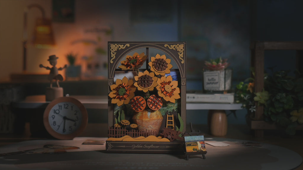 Binnenkort hangt aan jouw muur een zonovergoten vaas vol met zeven stralende zonnebloemen, hun gouden koppen lijken te wiegen in de zomerbries. Met de 3D puzzel van Rowood, de gouden zonnebloemen, breng je die warme, vrolijke sfeer rechtstreeks naar je huis. Deze prachtige houten puzzel vangt de essentie van de zonnebloem, symbool van kracht, hoop en positiviteit, en transformeert het in een tijdloos decorstuk dat elke ruimte opfleurt. Daarbij krijg je nog een piepkleine schildersezel als extra decoratie met daarop een Van Gogh met de Franse zonnebloemvelden.