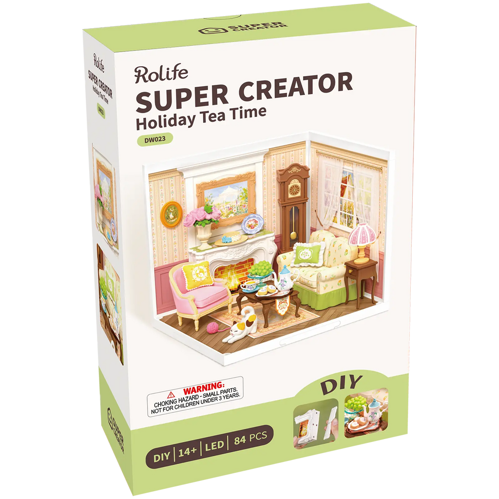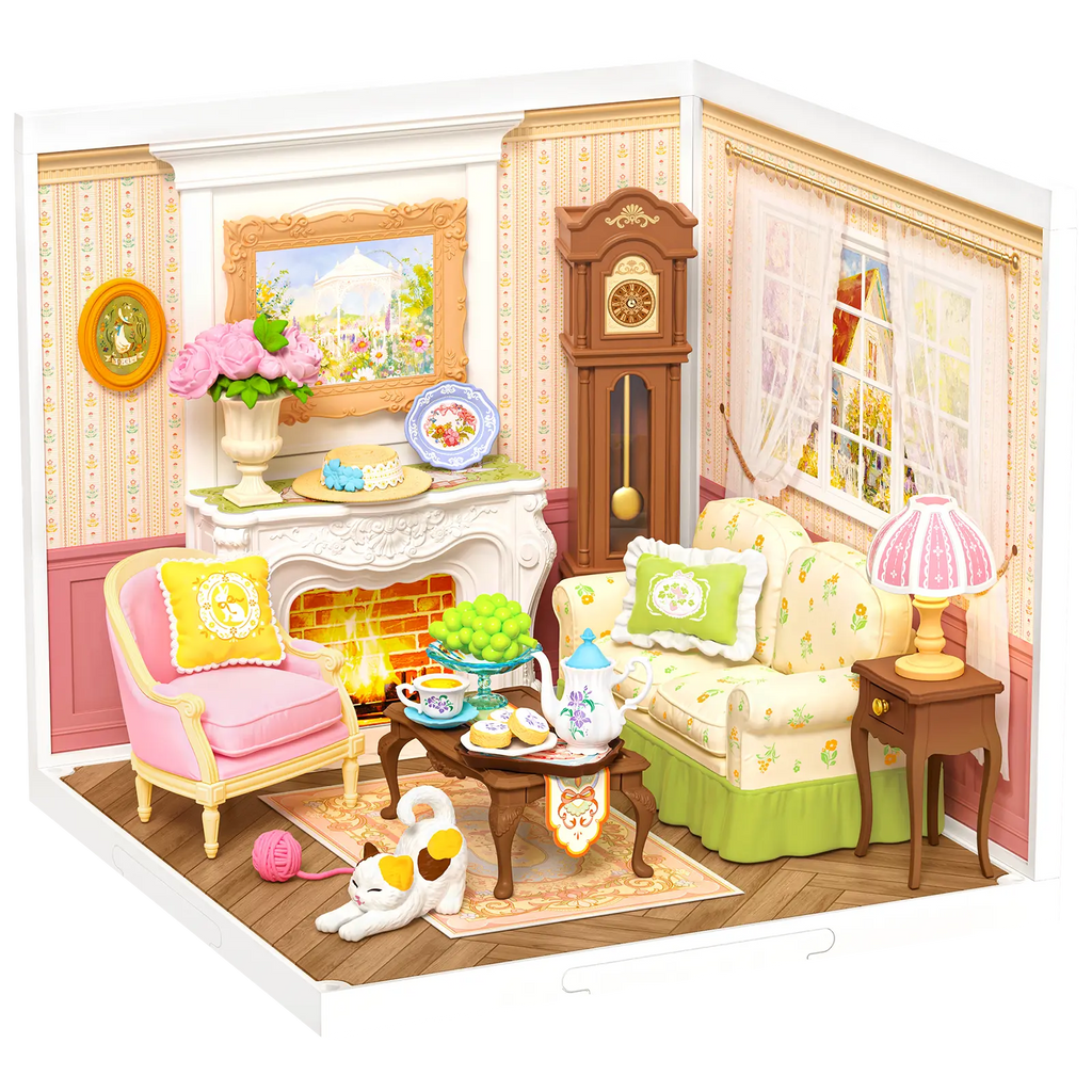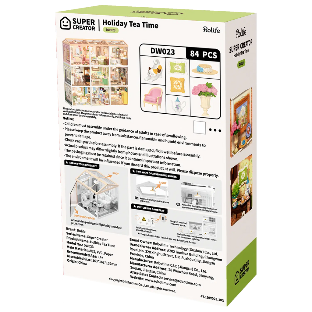 Met jouw eigen handen bouw je dit tafereeltje uit 84 onderdelen, allemaal gemaakt van handig kunststof dat gemakkelijk in elkaar klikt! Het miniatuurhuisje is 16,3 bij 16,3 centimeter breed en diep en 15,2 hoog. Dit bouwpakket is ideaal voor beginners en voor verzamelaars onweerstaanbaar. Jij kunt alle miniatuurhuisjes van deze serie stapelen tot een poppenhuis en uitbreiden met de grote Robotime Super Creator serie. Wil jij een extra touch geven? Er zijn transparante gevels, daken en balkons die je erbij kunt kopen om jouw theetijdhuis nog spectaculairder te maken.