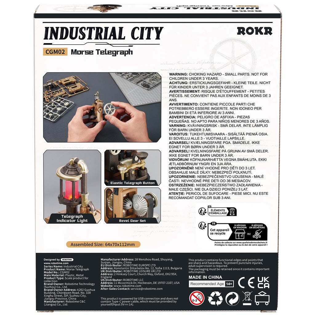 ROKR heeft het weer gedaan! Een fantastisch model waaraan van alles piept, beweegt en oplicht. Dit keer de Morse Telegraph, een briljant kunststof en metalen bouwpakket waarbij je een mechanisch telegraaftoestel bouwt. Niet zomaar een model, maar een apparaat vol tandwielen en een kliktoets zoals het vroeger was! Je hoort echt de piepjes als je de telegraafknop indrukt en die elastisch terugveert. Het donkerrode indicatielampje knippert synchroon mee met elke tik die je zelf invoert. Dankzij de conische tandwielset, in dit bouwpakket van kunststof en metaal voelt dit alsof je terugreist naar het tijdperk van de 19e-eeuwse ingenieurs!