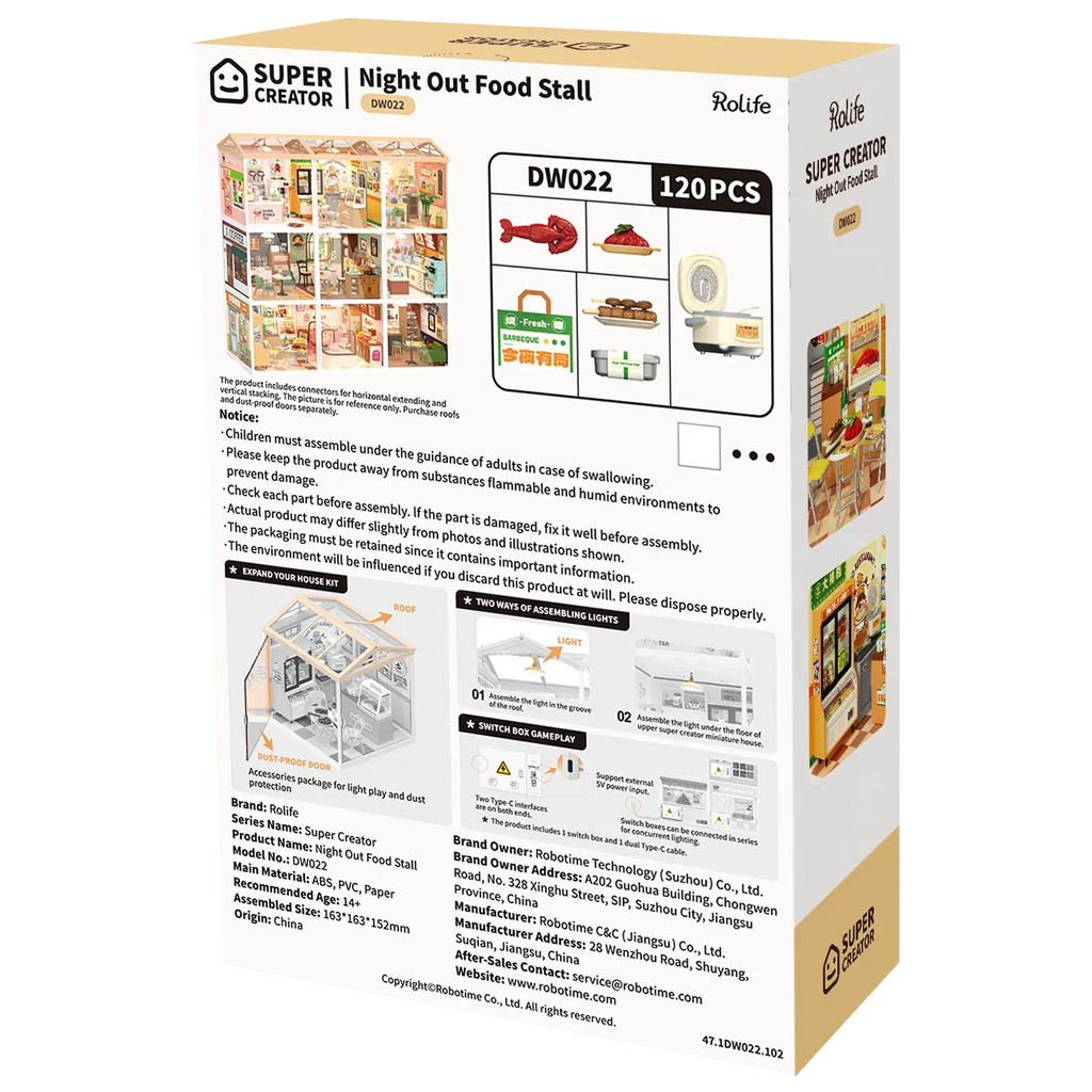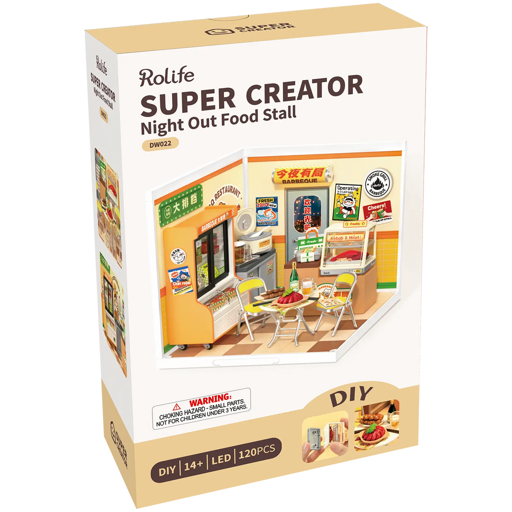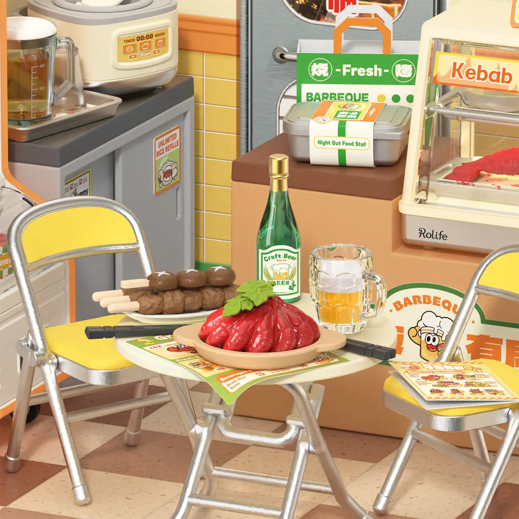 Gezellig sfeertje in deze levendige Aziatische avondsnackbar Night Out Food Stall! Denk aan warme lichtjes, de schuifdeur van de koeling laat de ingrediënten uitnodigend tevoorschijn komen en aan de tafel met klapstoelen kun jij wachten tot jouw spontane hapjes klaar zijn. Je kunt zelf kiezen wat je klaarmaakt, schep maar op uit de rijststomer, kies je drankje en je bijgerecht. De mix van neonaccenten, herkenbare reclameposters en realistische details vangt perfect het sociale uitgaansmoment dat in veel Aziatische steden zo populair is. Het informele samenzijn vormt de kern van jouw nieuwe miniwereldje.