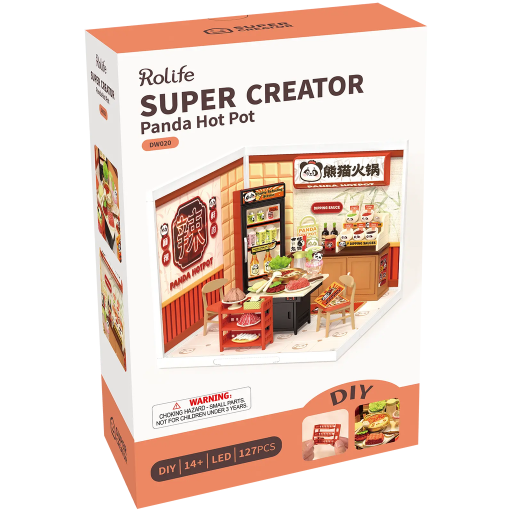 De Rolife Panda Hot Pot is niet alleen een lust voor het oog, maar ook een knap staaltje miniatuurtechniek. De deurtjes van de koelkast, keukenkastjes in dit kleine Chinese restootje kunnen open en dicht blijven staan, waardoor je dit huisje echt tot leven ziet komen. Dankzij het eenvoudige click-en-fit-ontwerp heb je geen lijm nodig om alles in elkaar te zetten. Met 127 onderdelen en een montagetijd van ongeveer 1 uur is dit bouwproject ideaal voor nieuwe én ervaren miniatuurbouwers geschikt. De schaal van 1:24 en de uiteindelijke afmeting van 16,3 x 16,3 x 15,2 centimeter maken dit kunststof bouwpakket geschikt voor iedereen vanaf 8 jaar.