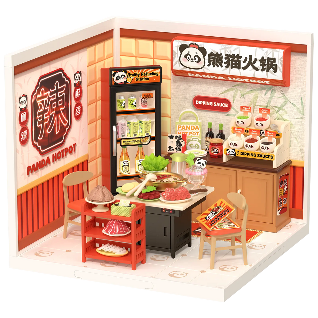 Maak je klaar voor een heerlijke Aziatische maaltijd, compleet met dampende soep, diverse groenten, dips, desserts en drankjes! De Rolife Panda Hot Pot staat klaar om je het beste van het beste te serveren, met een vleugje creativiteit en een vleugje vrolijkheid. De smakelijke details omvatten de levensechte hotpotopstelling, een goed gevulde koelkast en een rijkelijk gevuld dipstation. Geniet van dun verse kool en de realistisch gedekte tafel. Er zijn sauzen en toppings zoals knoflookpasta en fijngehakte groene uien verkrijgbaar. Haal jouw gekoelde pakjes melk of frisdrank uit de koelkast.