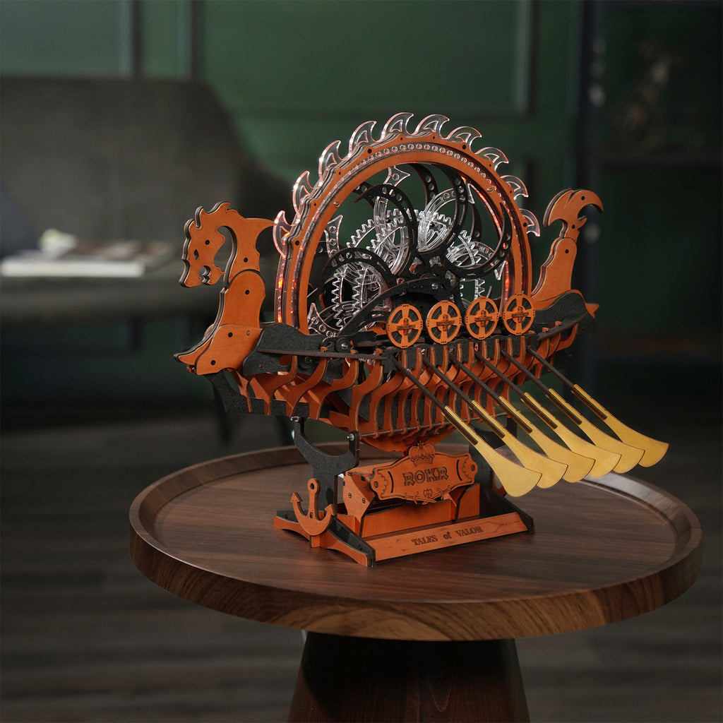 Nu moet je toch echt ophouden! ROKR blijft zichzelf overtreffen. Dit keer heeft het bekende bouwpakkettenmerk van Robotime een echt werkend Vikingschip voor jou ontworpen. Mét werkelijk roeiende riemen én verlichting! Dit houten bouwpakket voor volwassenen van deze fantastische boot is heel stilistisch in drie kleuren hout gehouden, zwart, bruin en crème. Van dit stoere drakenschip kun je de kop en staart verstellen in de houding die jij wilt. Maar het gaafst is natuurlijk het enorme, zwarte vliegwiel dat draaiend de twaalf roeispanen laten bewegen en de rugvin van de draak laat schijnen.